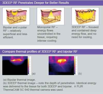 EndyMed's proprietary 3DEEP technology is a multi source, phase-controlled radio frequency energy source that is innovative, safe and effective. 3DEEP uses an array of multiple electrodes and a sophisticated algorithm to manage the phase of the energy flowing between sets of electrodes. The repelling forces between adjacent electromagnetic fields drives the energy vertically into the target tissue, significantly reducing the energy flowing along the skin's surface (and any potential side effects) and eliminating the need for skin cooling.